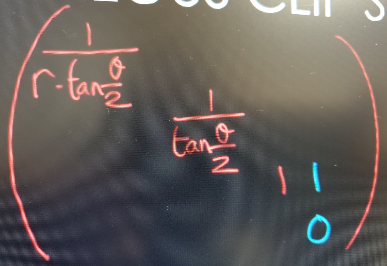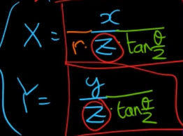 각도가 커지면 찍히는 영역이 훨씬 더 넒어 진다는 것이곳, 이는 더 많은 물체를 찍을 수가 있게 되었다는 얘기가 되는 거니까 원래는 이 각도에서는 얘가 한 이 정도 크기를 차지하고 있었다는 게 훨씬 더 넓은 공간을 찍을 수 있게 되면 쪼그라드는 효과가 일어나게 될 것이다. 그래서 `tan(각도/2)`로 나누어 좌표를 조정한다. near를 1, 각도를 180도로 가정했기 때문에 tan90 즉 1인 상태가 디폴트다. 그래서 tan 각도/2 로 나눠서 좌표를 맞춰준다.