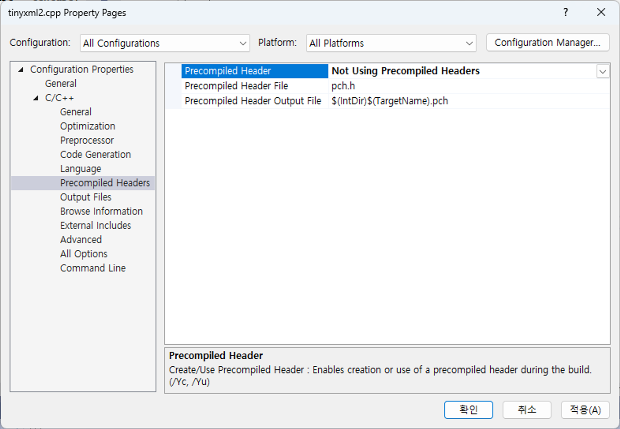 tinyxml2.cpp 에서 우클릭을 하고 properties에 들어가서