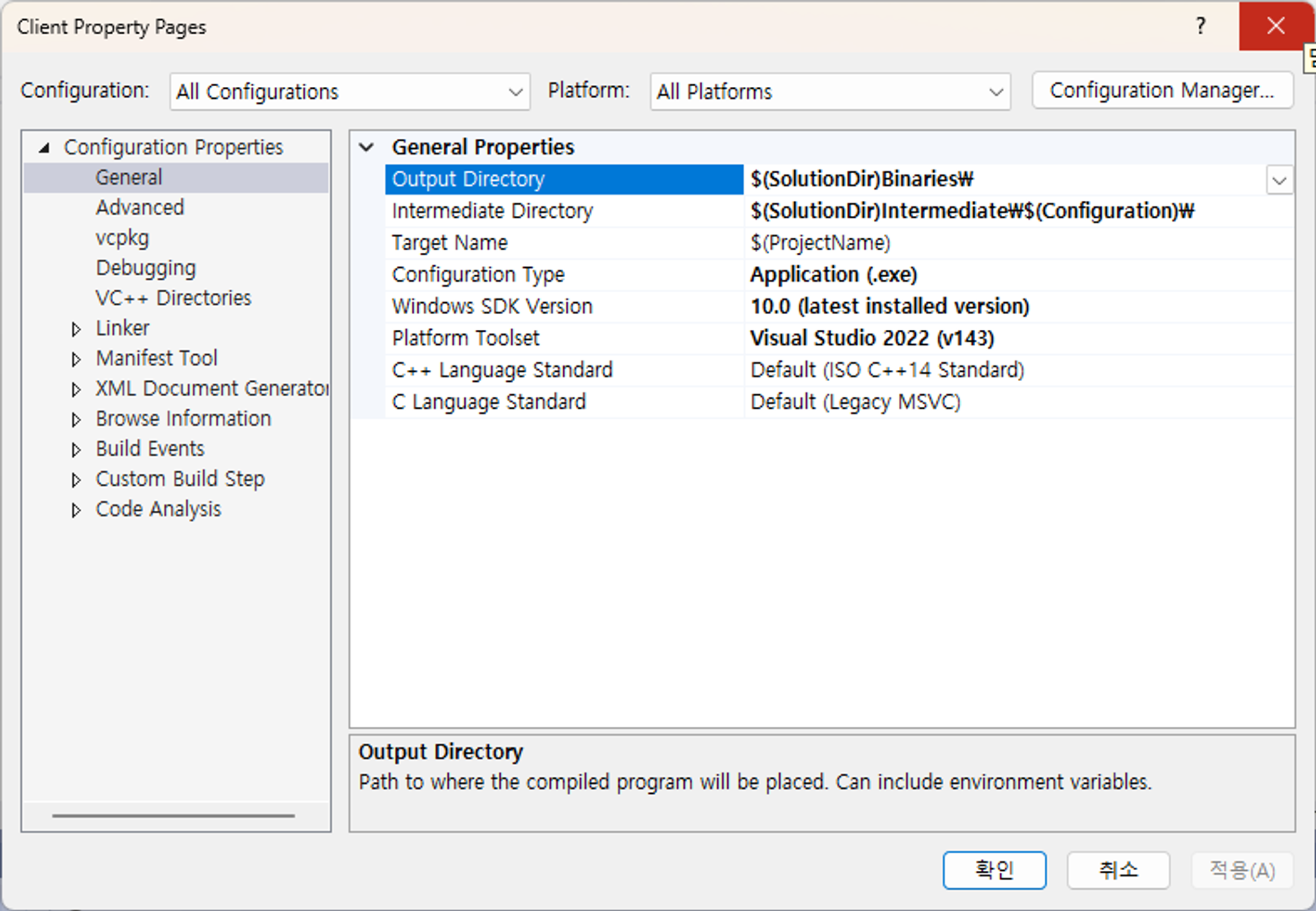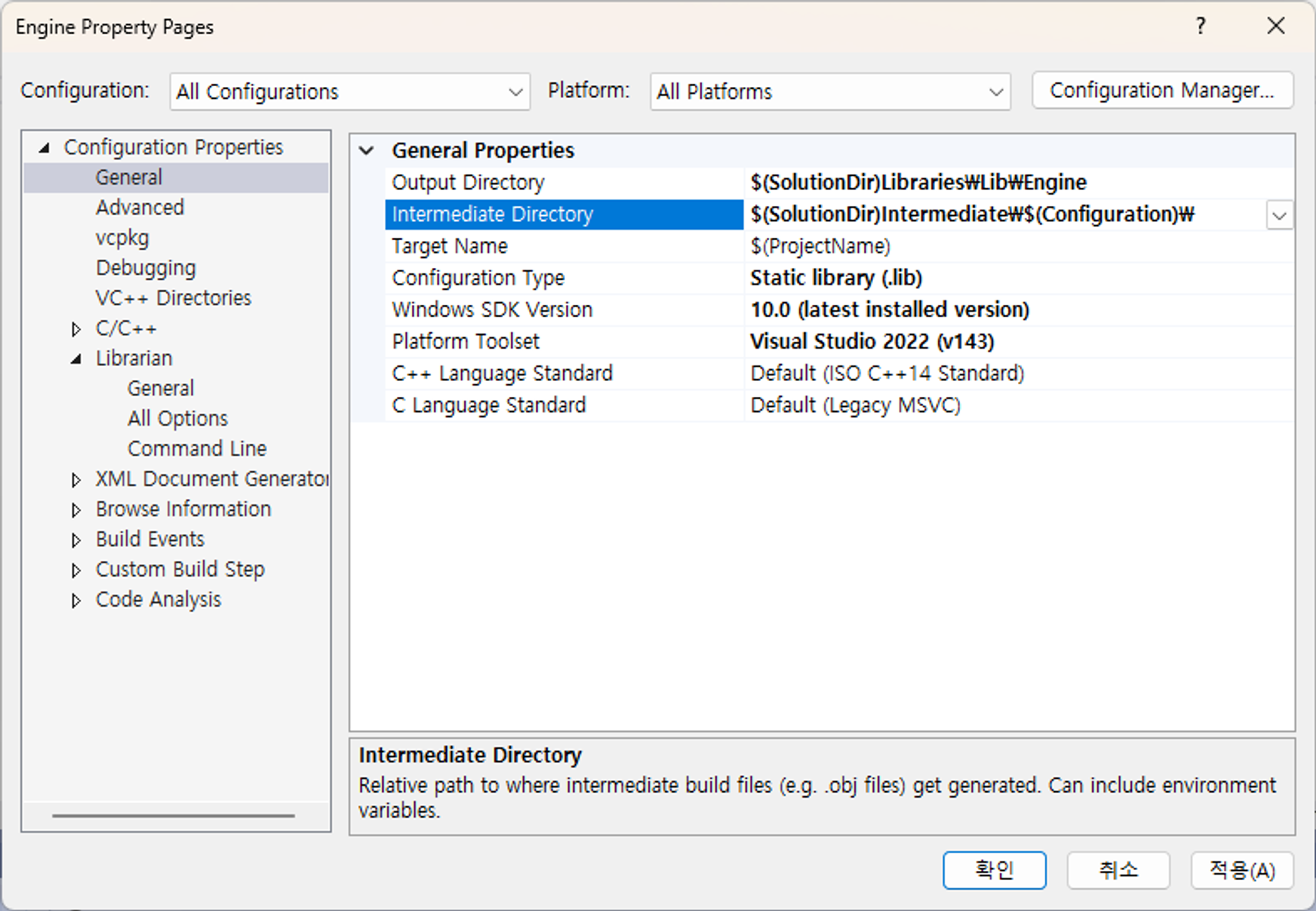 이렇게 OutputDirectory와 Intermediate Directory를 설정한다.