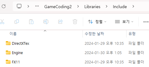 마지막으로 Engine 폴더를 만드는데 오늘 만들 Engine의 헤더파일들을 넣을 것이다. 이건 하나의 옵션이다. 여기다가 넣어줘도 되지만 원래 작업하고 있는 Engine 프로젝트의 경로를 세팅해 줘도 된다. 하지만 그렇게 하면 .cpp랑 여러 가지 파일들이 섞이기 때문에 원하는 건 헤더파일들만 모아서 관리하는 것이 편하기 때문에 Include / Engine에 모든 헤더 파일들을 복사해서 관리하는 경우도 있다. 만약 Engine을 다른 사람에게 공개할 때도 여기 있는 헤더파일들과 Lib 파일들만 전달해주면 된다.