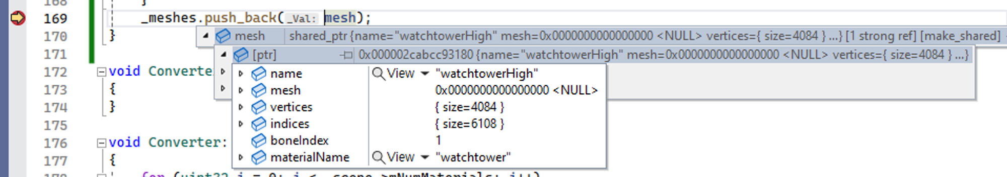 ReadMeshData도 break point를 찍어서 살펴보면 정점이 몇 개 들어가 있는지 등등과 관련된 정보들을 살펴볼 수가 있을 것이다.