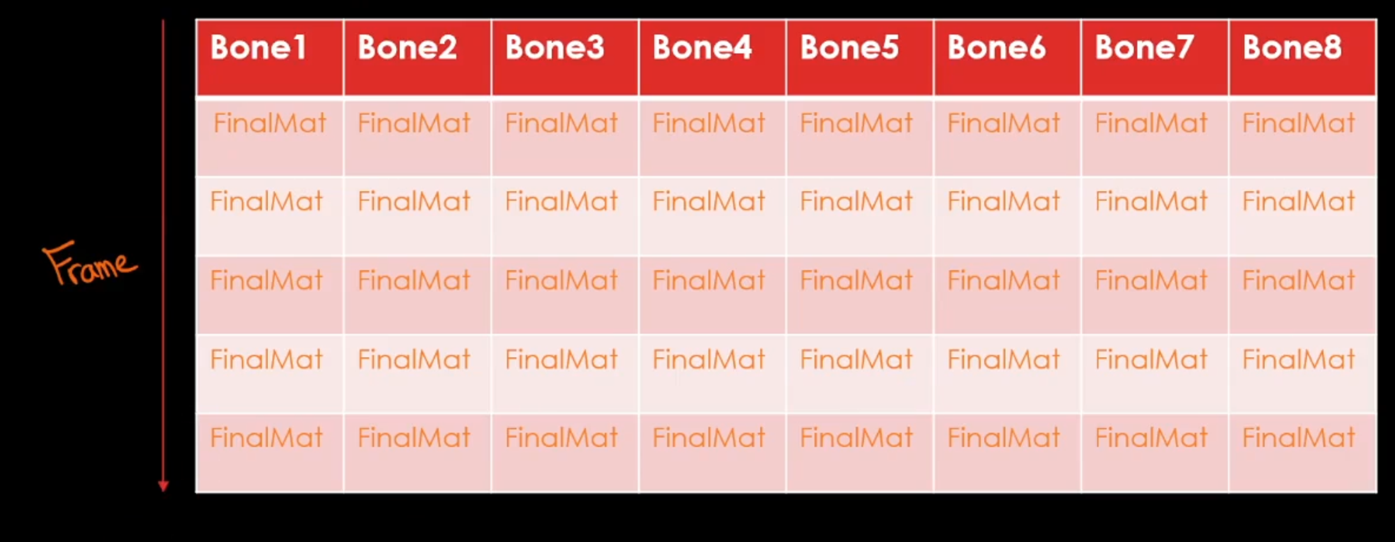 텍스쳐를 만들어서 모든 애니메이션의 모든 본의 모든 트랜스폼에 대한 정보를 담아서 전달해 줄 것이다.