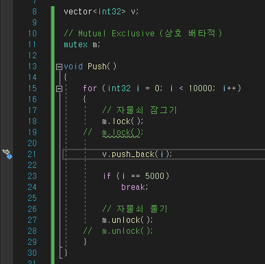 여기서 해야 할 건 puch_back을 하는 동안에, 즉 vector<int32> v를 건드리는 동안에 다른 애들은 이 벡터를 건드리지 못하도록 서로 신호를 정해주는 것처럼 순서를 정해서 한번에 1명만 접근하도록 유도를 해줘야 하는데 그게 기본적으로 lock의 개념이라고 할 수 있다.