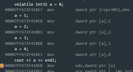 이 상황에서 다시 어셈블리창을 보면 실제로 a라는 변수에 1,2,3,4를 각각 넣어주는 부분이 들어간다고 볼 수 있다.