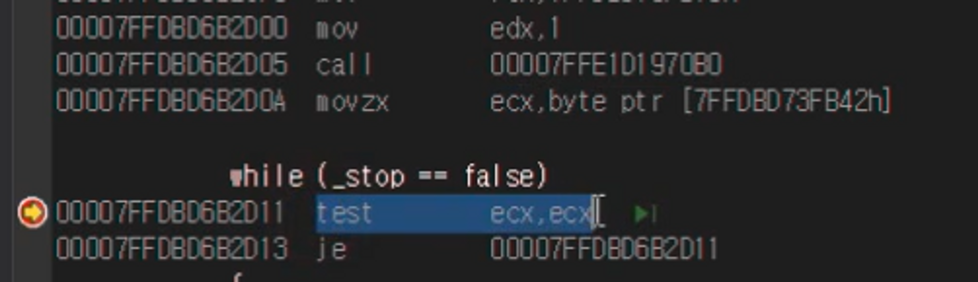realese에선 breakpoint 잘 안먹는다고 하지만 그래도 ThreadMain의 while(_stop == false)에 잡아보자.