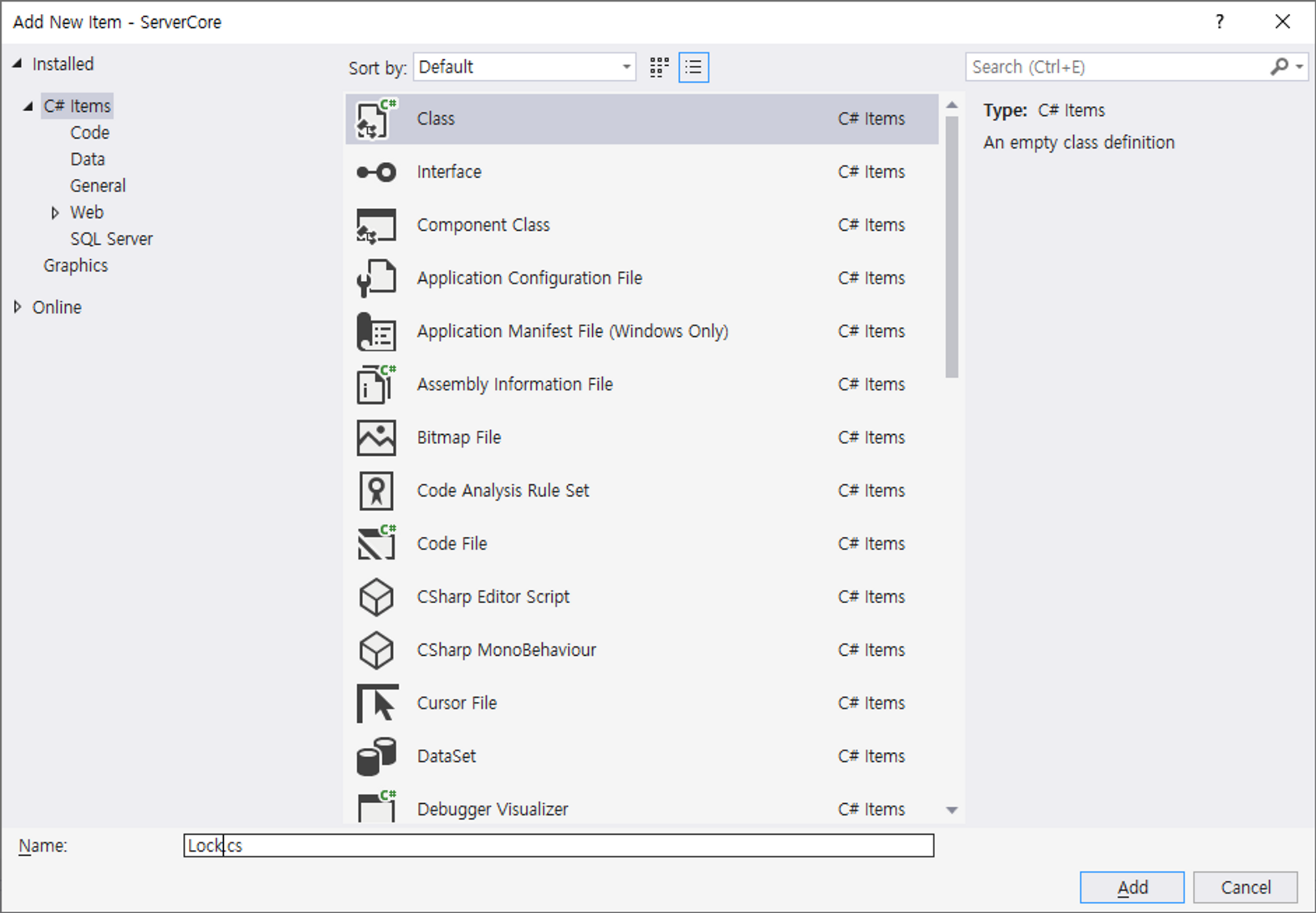 ServerCore에서 새 항목을 추가해서 Lock이라는 별도의 파일로 빼서 만들어 보자.
