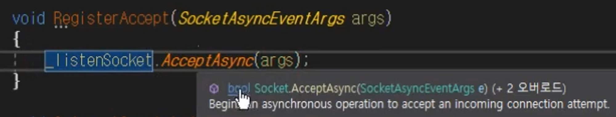 인자로 socket을 넣어줘야 하는데 args.찍어 보면 AcceptSocket을 뱉어주고 있어.