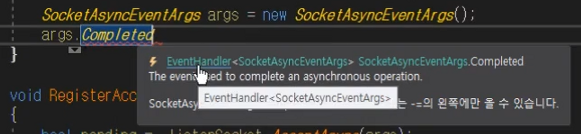 SocketAsyncEventArgs얘가 일꾼 같은 느낌이야. 당장 _listenSocket.AcceptAsync(args)했을 때 당장 값을 추출할 수 없었으니까 이런 저런 정보들을 다 SocketAsyncEventArgs를 통해서 전달해 주는 것이다.