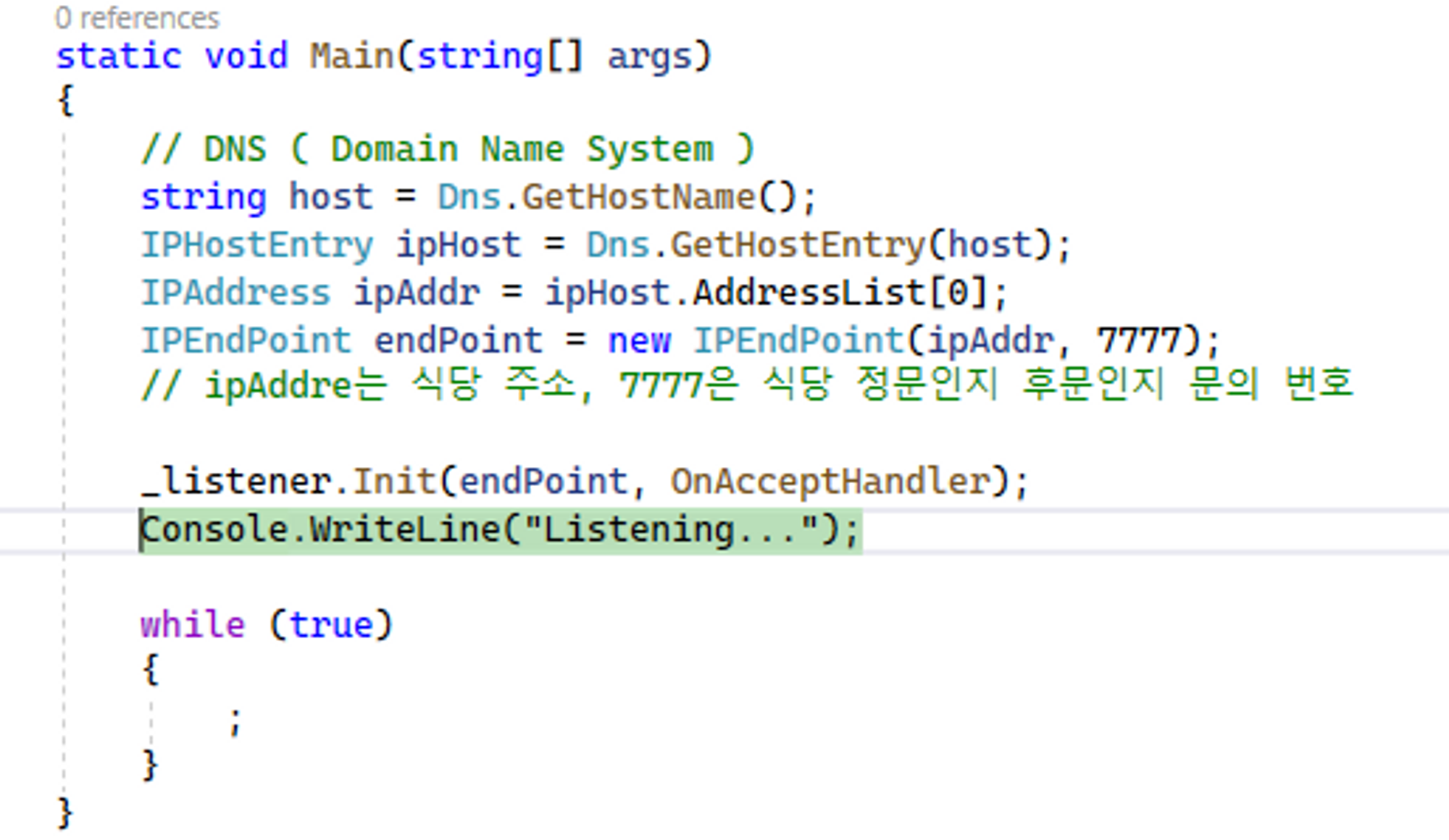 _listenSocket.Bind(endPoint); // 식당 주소와 후문인지 정문인지 기입을 해준 것
