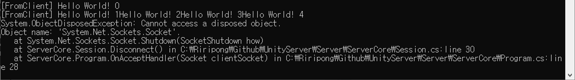 ServerCore의 Program의 OnAcceptHandler에서 Disconnect를 두번 입력해보자. 실행해 보면