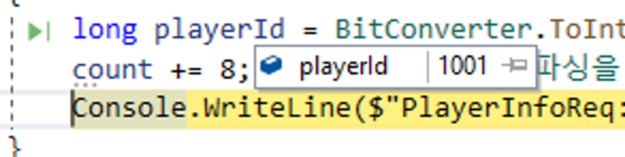 -> 받는 쪽도 수정을 해준다. ClientSession에 OnRecvpacket에도 count를 선언하고 size와 Id를 추출할 때 받은 파일의 바이트 수를 카운트 해준다. switch문으로 id가 PlayerInfoReq라면 playerId에 Id를 추출하고, 출력도 한다.