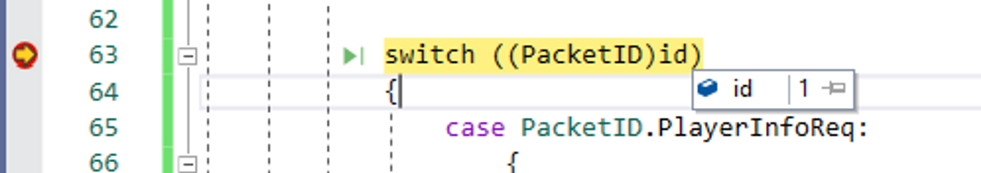 switch((PacketID)id)에 breakPoint을 잡고 실행을 해보자.
