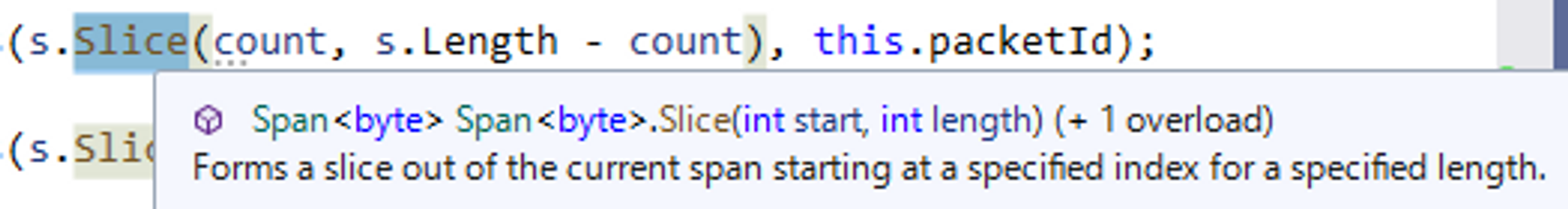 ReadOnlySpan<byte> s = new ReadOnlySpan<byte>(segment.Array, segment.Offset + count, segment.Count - count);