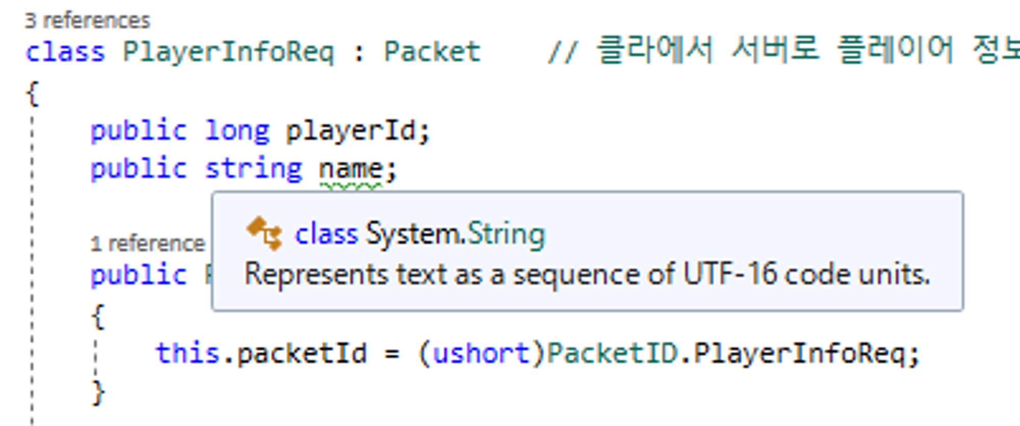 -> class PlayerInfoReq에 public string name;을 추가한다. Write에서 ushort nameLen = (ushort)Encoding.Unicode.GetByteCount(this.name); 이렇게 name의 byte배열 길이를 뽑아내고 success &= BitConverter.TryWriteBytes(s.Slice(count, s.Length - count), nameLen); 이렇게 segment에 밀어 넣어준다. count += sizeof(ushort); count도 업데이트 한다. Encoding.Unicode.GetBytes(this.name); 로 name이라는 string을 byte 배열로 반환 Array.Copy(Encoding.Unicode.GetBytes(this.name), 0, segment.Array, count, nameLen); 이렇게 하면 원하는 배열 segment에다가 복사를 해주게 될거야. count += nameLen; count를 nameLen 만큼 증가해 준다. 즉 길이와 내용을 넣어 줬다. success &= BitConverter.TryWriteBytes(s, count);최종 카운트를 세는 코드를 맨 아래로 옮겨준다.