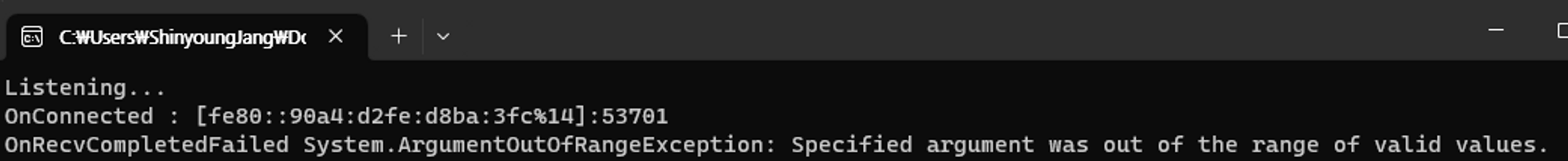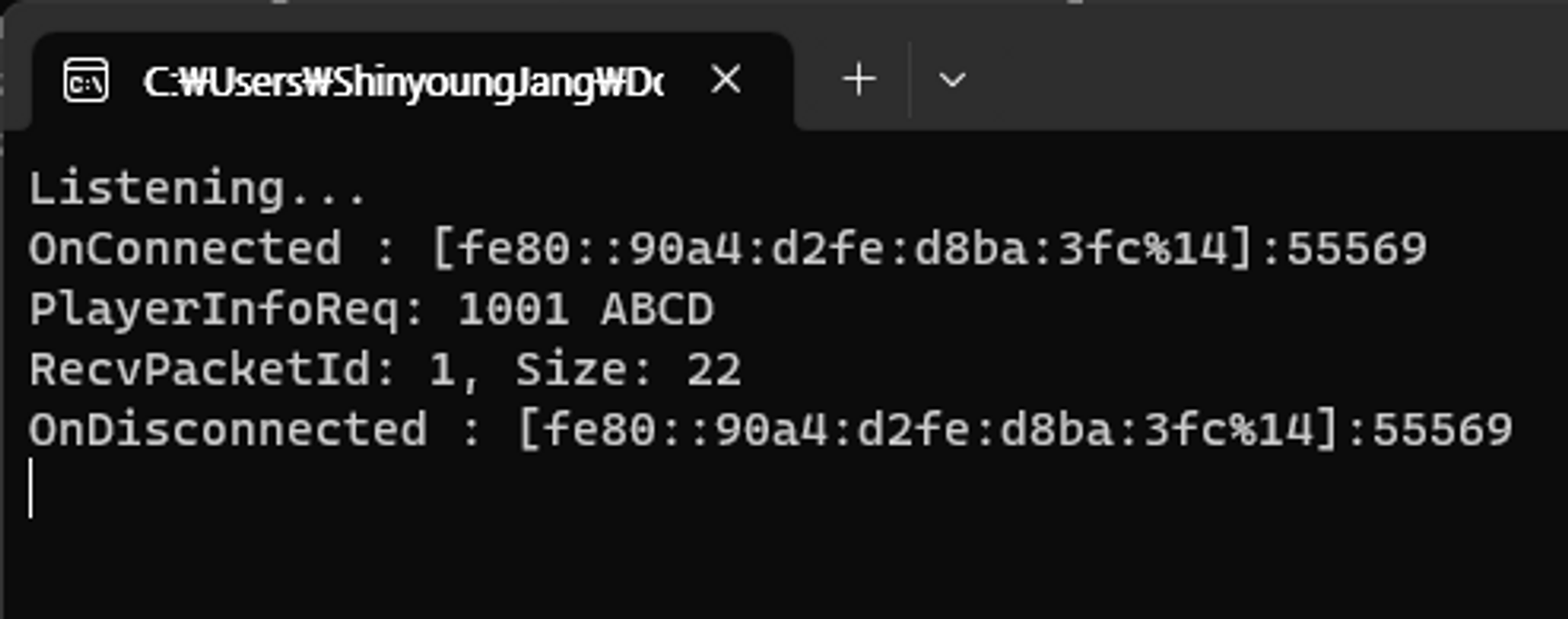 -> 해킹 됐을 때 어떻게 될지 보기 위해 ServerSession의 Write에서 nameLen을 success &= BitConverter.TryWriteBytes(s.Slice(count, s.Length - count), (ushort)999); 이렇게 엉뚱한 값을 넣어준다. 실행해 보면 에러 메시지가 뜬다. 다시 nameLen으로 복원 시켜준다.