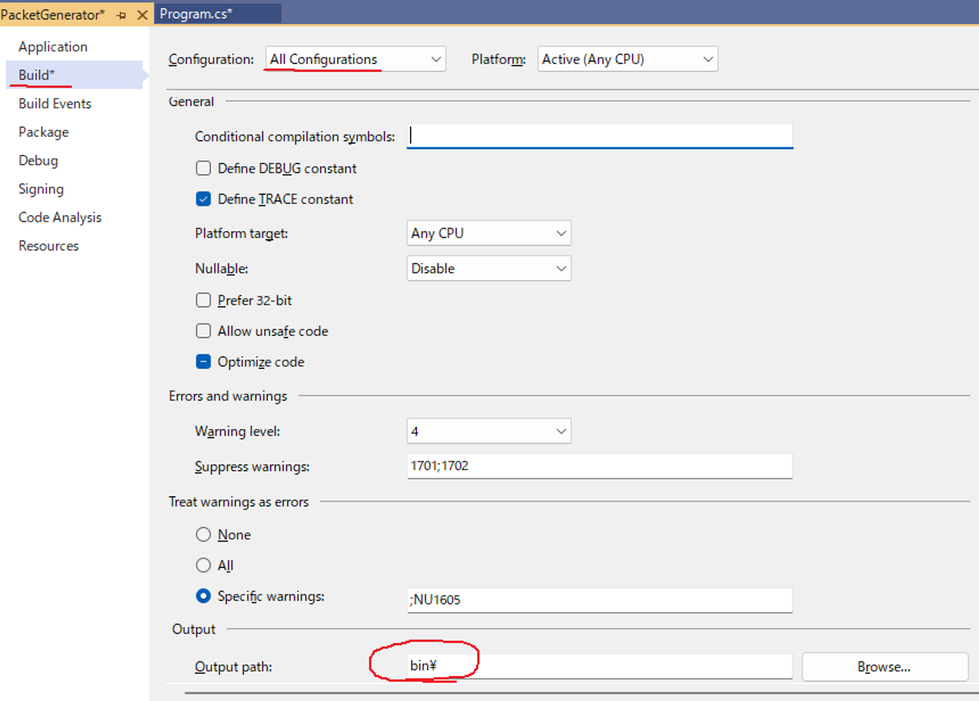 -> PacketGenerator를 실행하면 생성되는 파일의 위치를 bin으로 바꿔주기 위해 PacketGenerator 프로젝트에서 속성에 들어가 Ouput path를 설정해 준다.