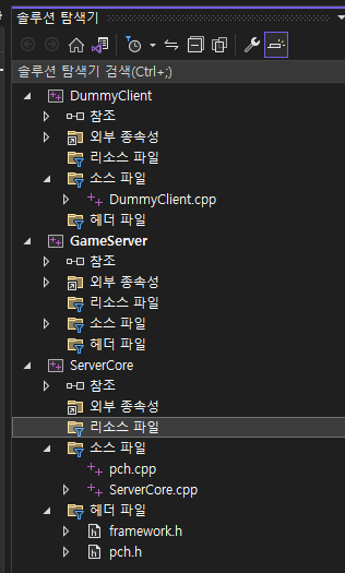 CorePch 얘를 굳이 따로 파준 이유는 pch라는 애 자체는 GameServer랑 DummyClient에서 참조할 수 있는 파일이 아니다. 말 그대로 ServerCore 내부에서만 활용하는 것이기 땜문에 실질적으로 GameServer나 DummyClient 에서도 참조하길 원하는 그런 애들을 이 CorePch에다가 따로 분류를 해가지고 넣어 놓도록 할거야.