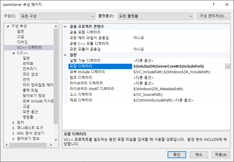 즉 우리가 참조할 라이브러리는 어디에 있고, 참조할 라이브러리가 참조하는 헤더파일들 즉 ServerCore/Utils의 헤더파일들은 어느 경로에 있는지를 알려줘야 된다고 보면 된다.