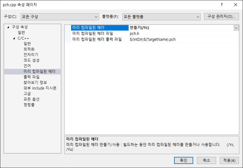 미리 컴파일된 헤더를 사용이 아니라 만들기로 해주고 적용, 확인을 눌러준다.