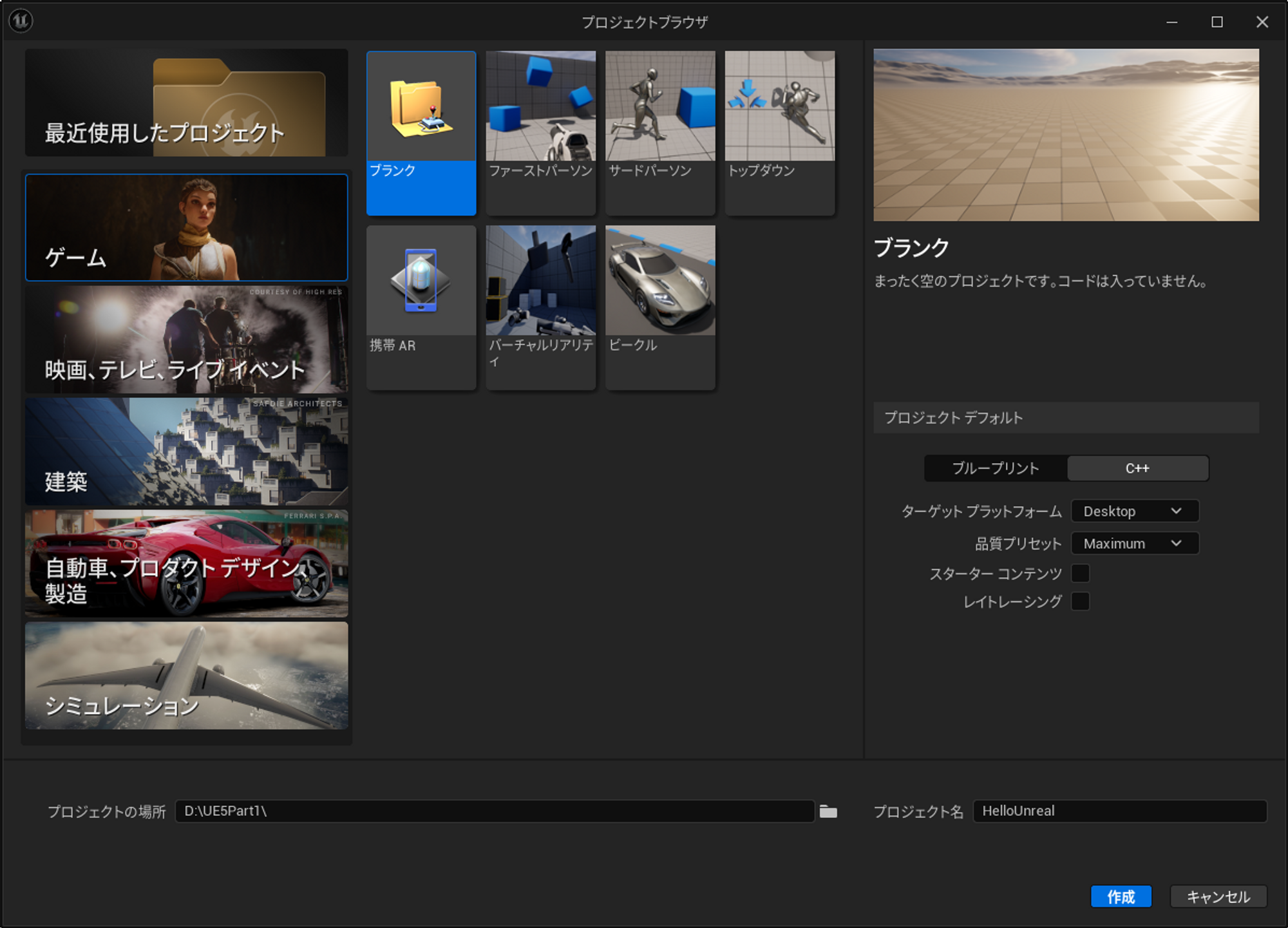 언리얼 엔진을 실행하고, Games→Blank를 선택하고, C++를 선택합니다.