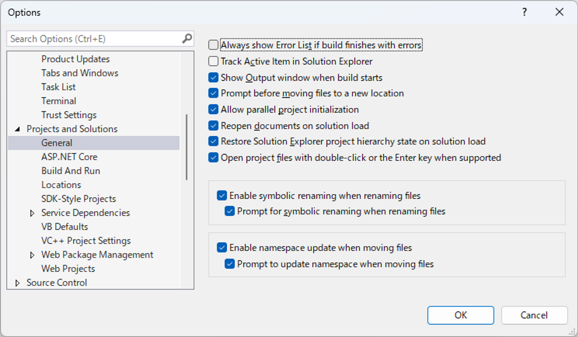 tools→ options→project and solutions→general로 가서