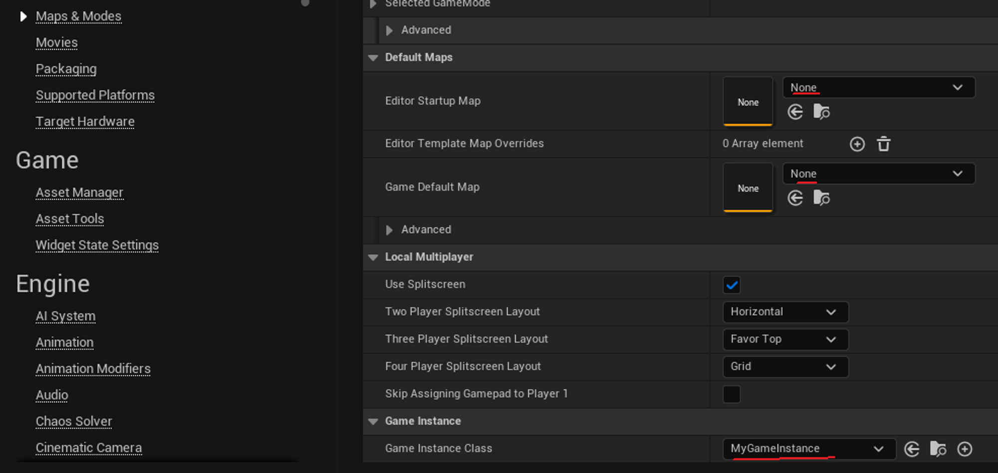 오픈월드 그래픽 지금 필요 없기 떄문에 DefaultMaps에서 Map 두개를 None으로 해줍니다.