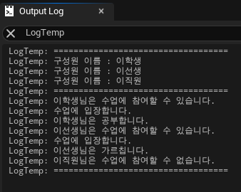 UE_LOG(LogTemp, Log, TEXT("%s님은 수업에 참여할 수 없습니다."), *Person->GetName());