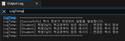 Broadcast로 OnChaged에 AddUObject 되었던 학생 3명의 GetNotification에 InSchoolName과 Contents가 전달되면서 메시지를 받게 된다.